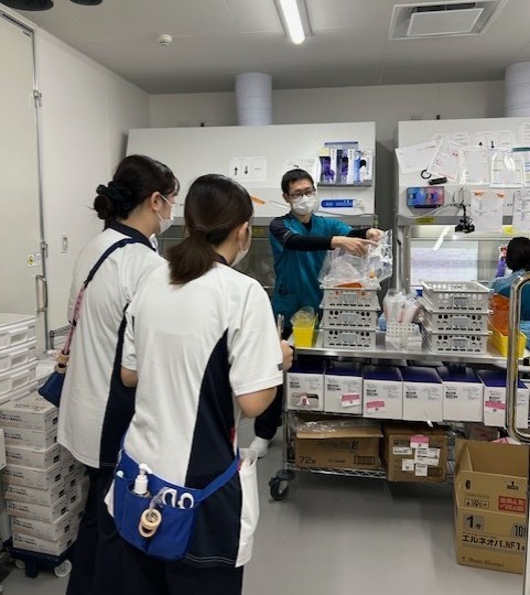とても強い薬剤を使用するので、点滴のミキシングやセットなど薬剤部との連携も重要です。見て学ぶことが多くあります。対象の患者さんが来るまでの間に確認をして、準備をします。薬の取り扱いにも注意が必要です。
