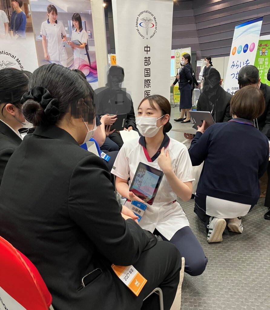 会場には200名くらいの学生さんが来ていました。当院の所にも始まってすぐ学生さんが来てくれました。今回初めて合同説明会の担当となった看護師さん「なんか、緊張する~💦」といいながらもそこはやっぱり先輩!しっかりと当院の良さを伝えてくれました。