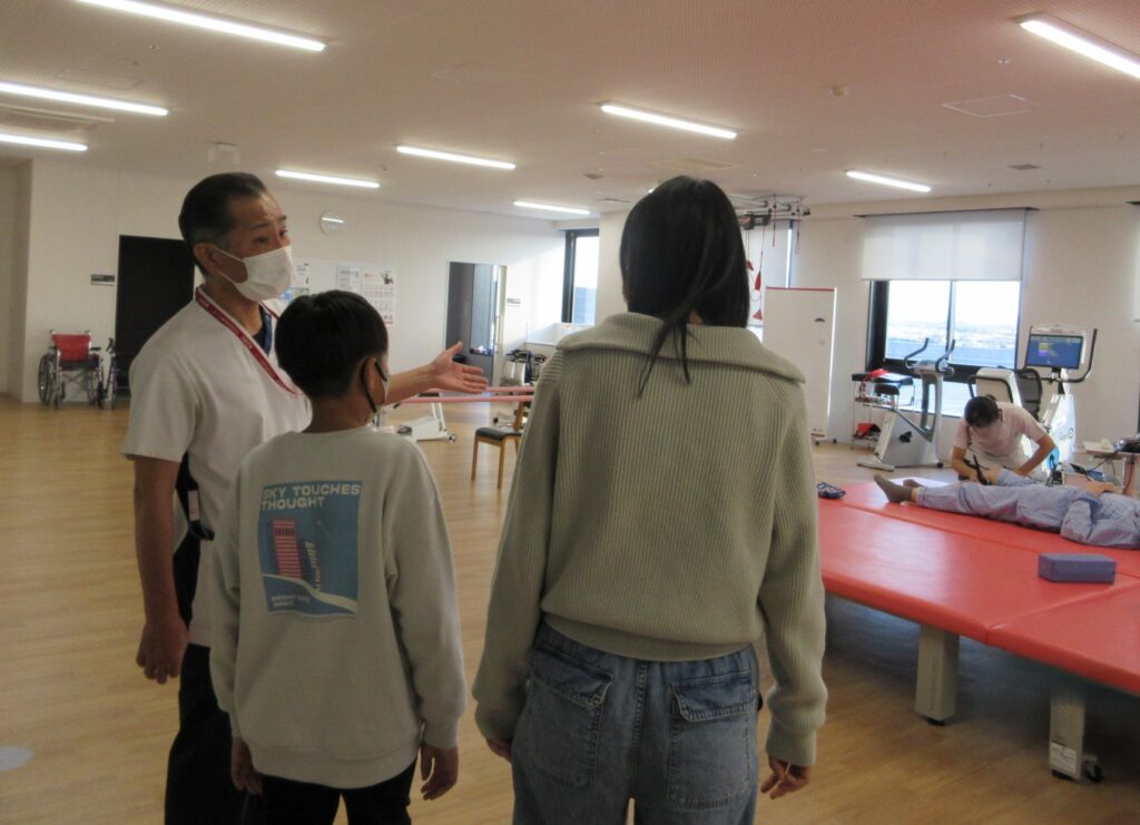 リハビリに興味があるとの情報を受け、急遽リハビリの責任者にリハ室を案内していただきました。運動療法をメインに作業療法も見させていただきました。どうだったかな?さらに興味を持ってくれると嬉しいですね。