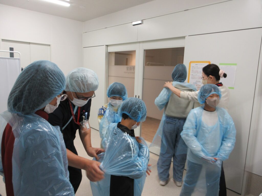 今回もOPE室を見学します。まずはガウンを着て、帽子をかぶって準備をします。何だか物々しいですね