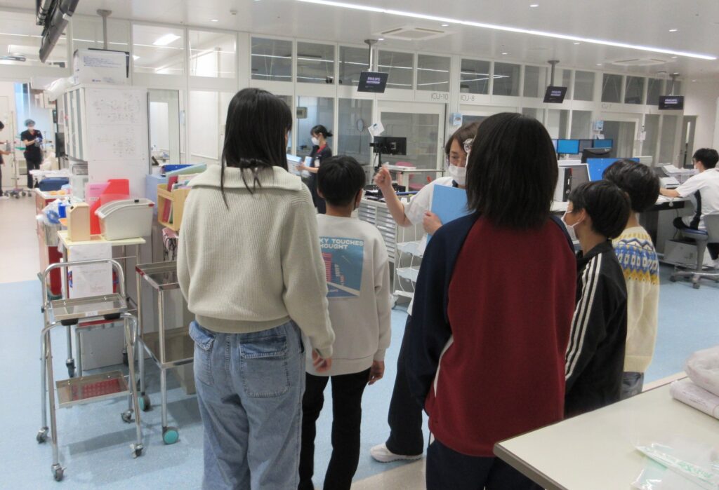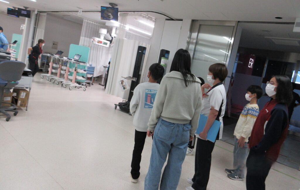 次に救急外来とICUの見学に行きました。丁度救急車が入ってきてあわただしくなったので、お邪魔をしないように遠くから見つめました。