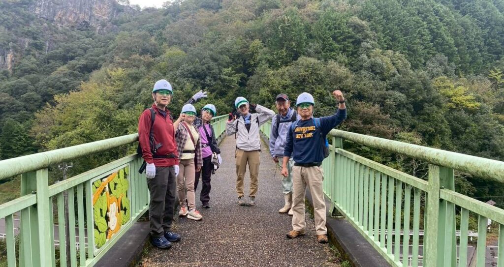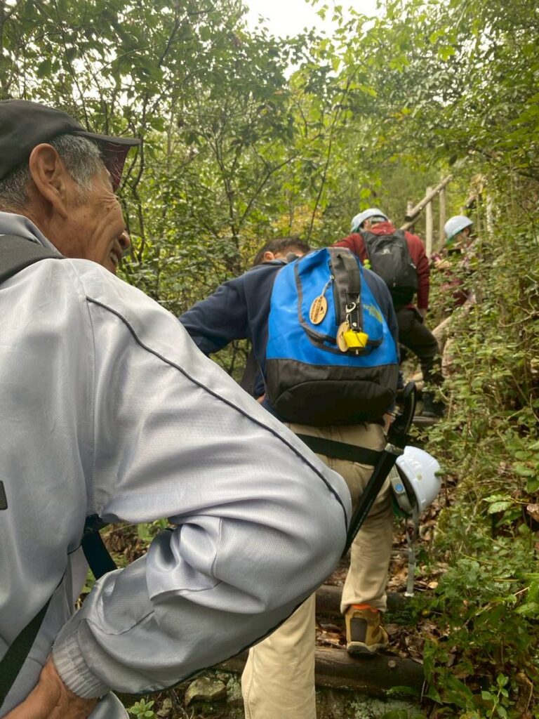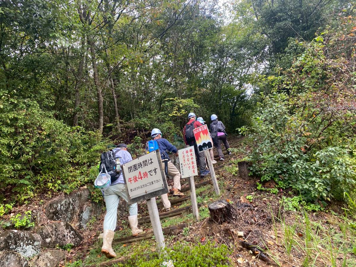 これくらいなら行けるっと余裕でそれぞれ笑顔で登っていきます。この日は雨上がりだったので砂利や落ち葉で結構滑ります。