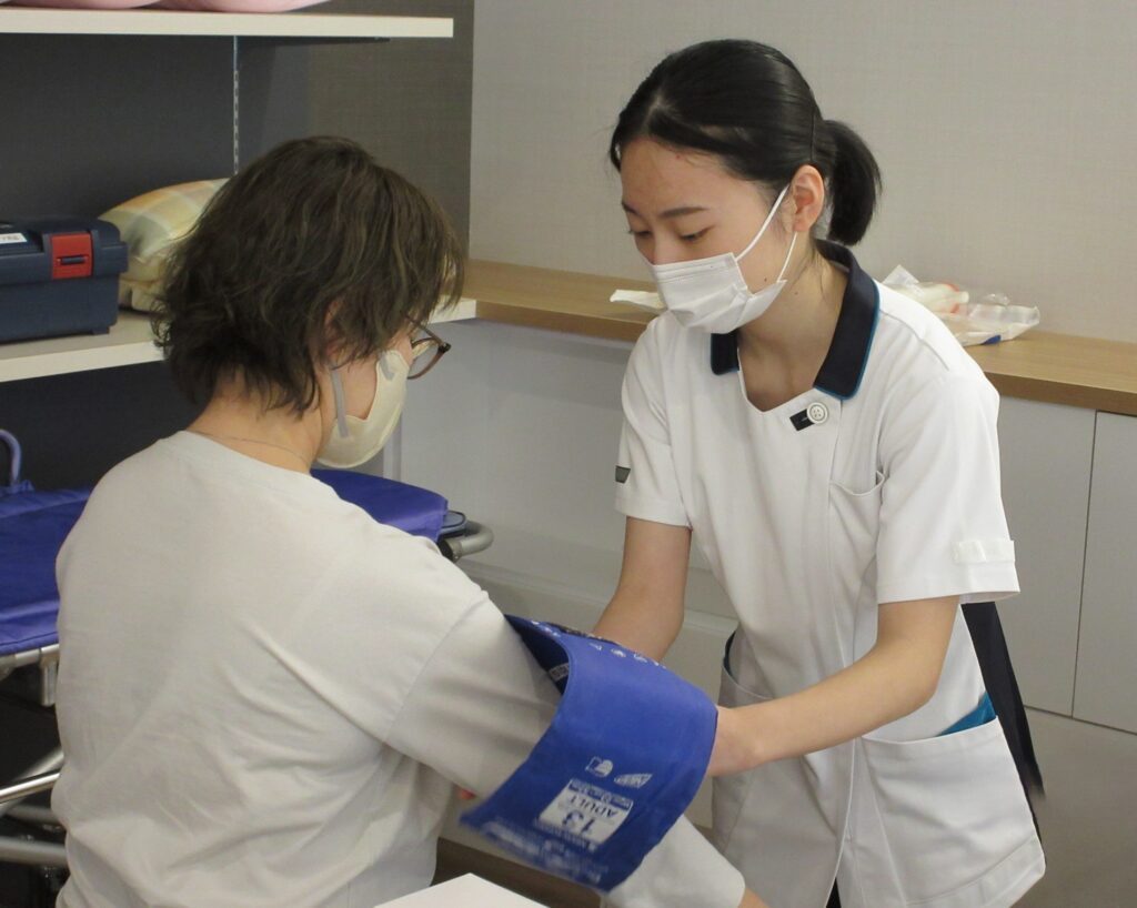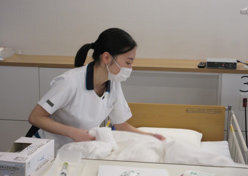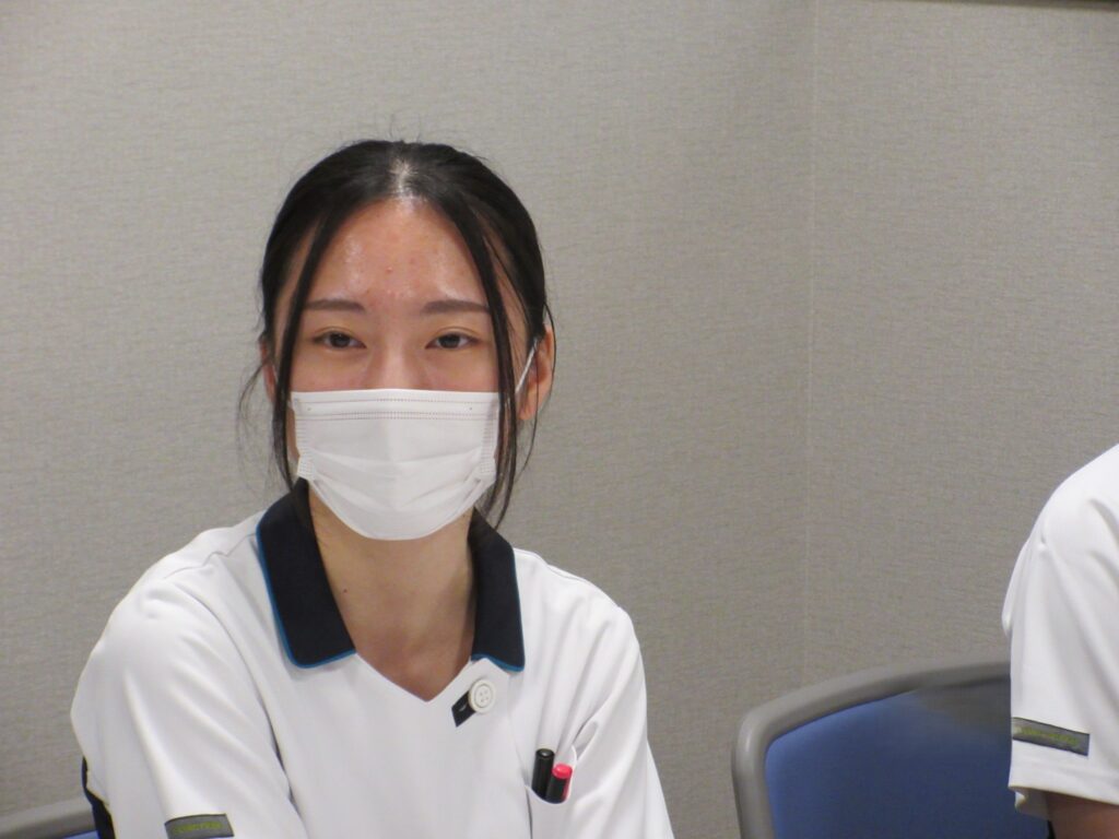 1年目Ns)私は急性期でやっていけるか不安だったけど、先輩たちに支えられて今頑張れています。同僚とも楽しくやっています。はじめは不安だと思うけれど先輩たちが助けてくれるので安心して来てほしい。今は学生生活を楽しんでください。