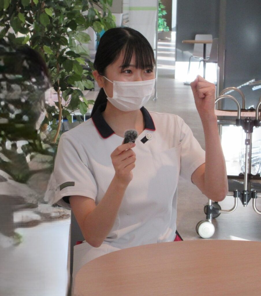 1年目看護師)今は明確な”こうなりたい”というのはないけれど、じっくり看護のできる回復期にも興味がある。でも若いうちにやっぱり急性期をやりたいと思っています。先輩たちに支えられて今はここで看護師になってよかったなと思っています。